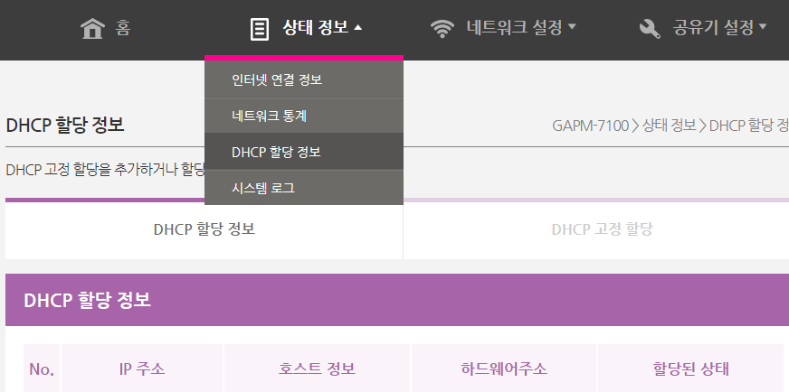 상단부분에 상태정보 메뉴에서 DHCP 할당정보를 찾으면 현재 접속이 되어 있는 아이피 리스트를 확인 할 수가 있다.
