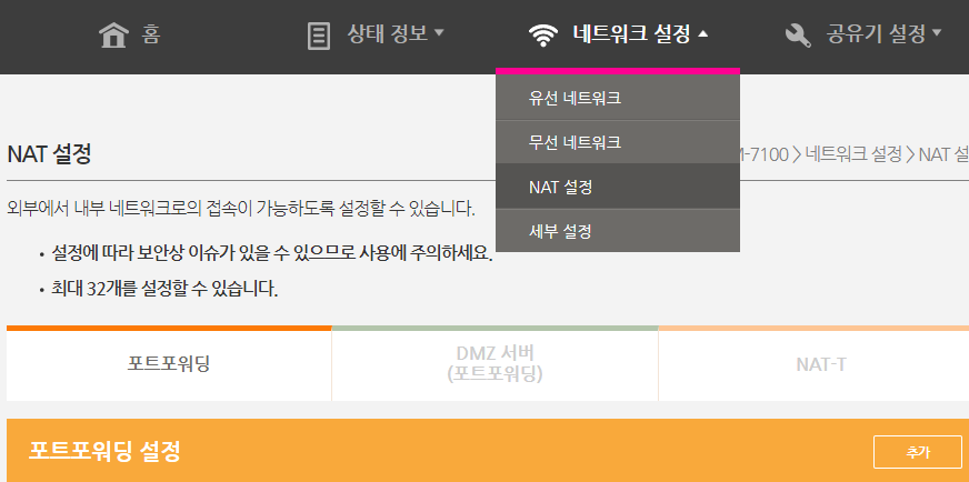 여기서 메뉴가 포트포워딩은 선택하지 말구 DMZ서버(포트포워딩)으로 선택해야된다. 만일 설정을 둘다 했다면 서로 충돌이 일어나니 주의 해야된다.